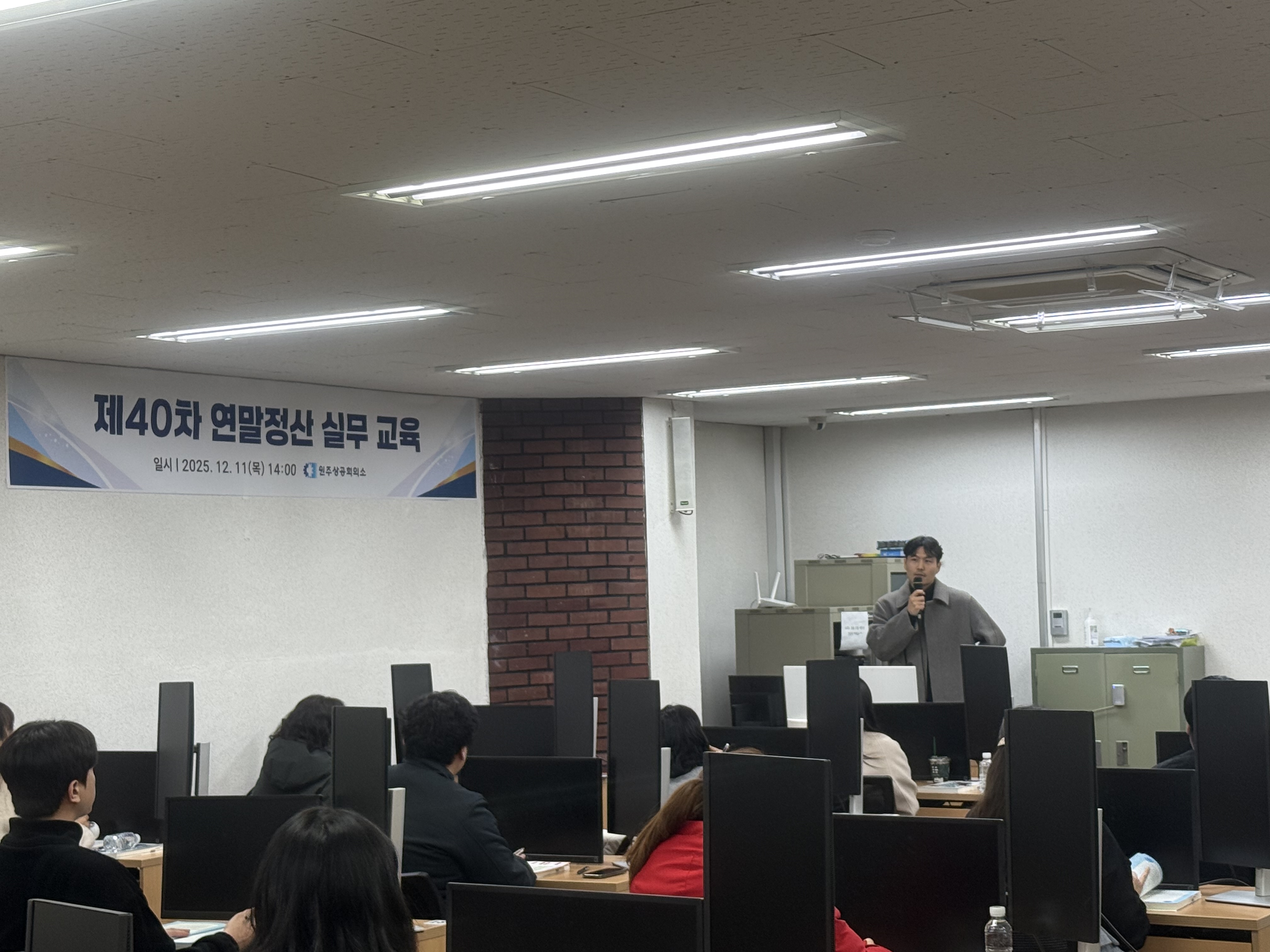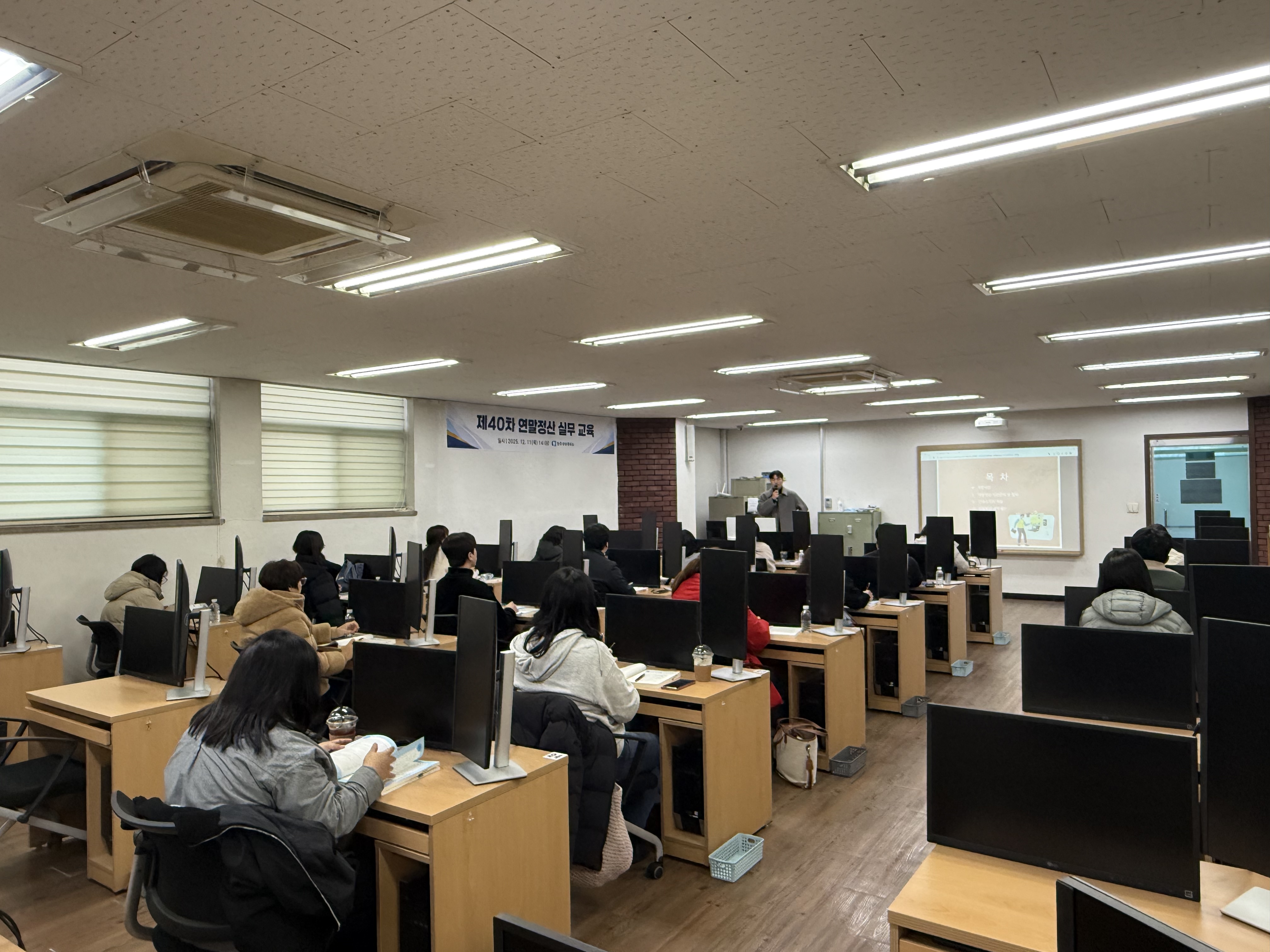 우리 회의소는 12월 11일(목) 14:00-17:00 상의 1층 상시시험장에서 '제40차 연말정산 실무 교육'을 개최하였다. 이번 교육에는 관내 회원업체 실무 담당자 30명이 참석하였으며, 권찬우 세무사의 진행으로 25년 주요 개정사항, 연말정산 사전준비 및 절차, 근로소득의 개요, 연말정산 세액계산 등 실무 핵심 내용을 교육하며 참석자들의 이해를 도왔다. |