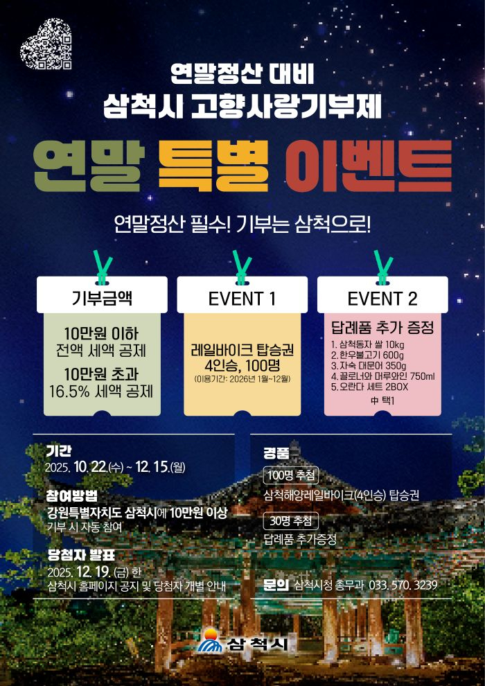| ‒ | [삼척시]해양레일바이크 탑승권 증정 '삼척시 고향사랑기부제 연말 특별 이벤트' |