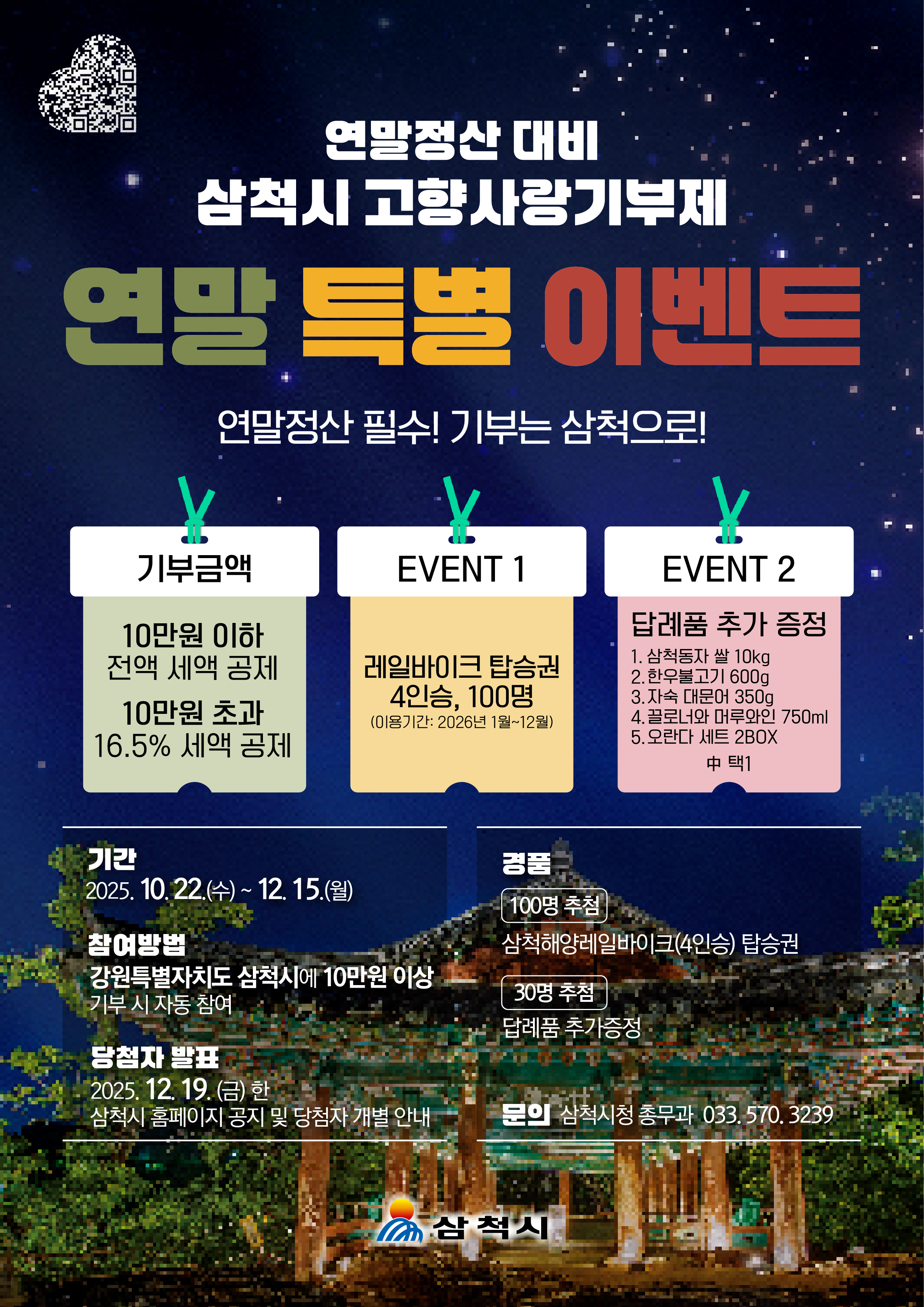 | 제목 | [삼척시]해양레일바이크 탑승권 증정 '삼척시 고향사랑기부제 연말 특별 이벤트' | ||
