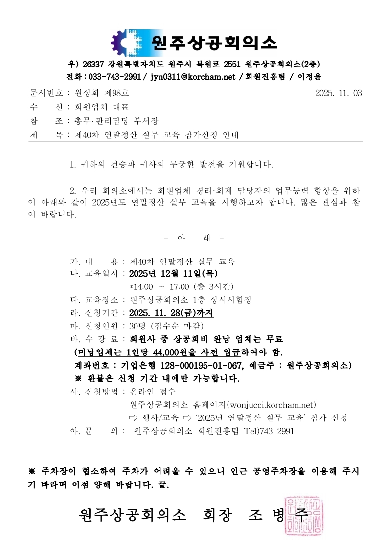 대표전화 : Tel : 033-743-2991~4 문의 : wonju@korcham.net