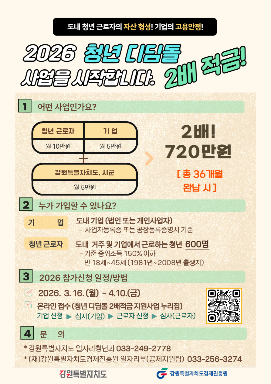 | 제목 | [강원특별자치도]「2026년 청년 디딤돌 2배 적금 지원사업」신청 안내 | ||